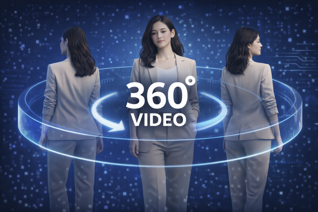 最新の**「AI 撮影」**技術では、複数の角度から撮影した静止画や、トルソー(マネキン)に着せた画像データから、AIが中間の動きを補完して滑らかな360度動画を生成することが可能です。これにより、大がかりな動画撮影セットを組む必要がなくなりました。